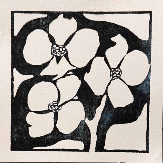 DogwoodLinocut print, watercolor on Strathmore paper